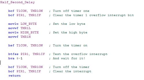 Assembly code. I have recently started using a 18 PIC 4500 and my first attempt at programming it in assembly was to make it blink one LED on a loop. Move 11111111 to PORT1.
